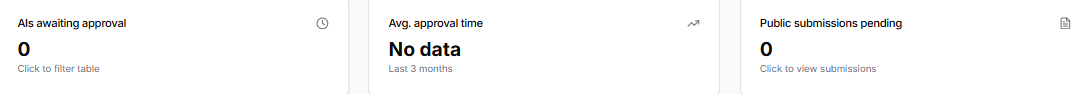 Avg. Approval Time – Shows the average time it has taken to approve AI systems over the last 90 days. This metric helps track workflow efficiency across the review process.