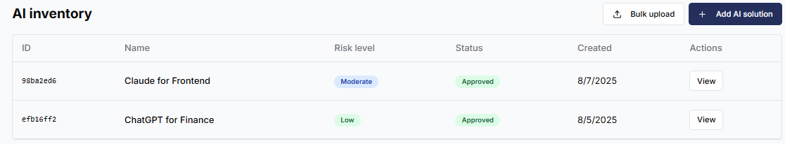 AI Inventory – Shows all AI systems added by internal users. This includes their name, risk classification, creation date, and current approval status.