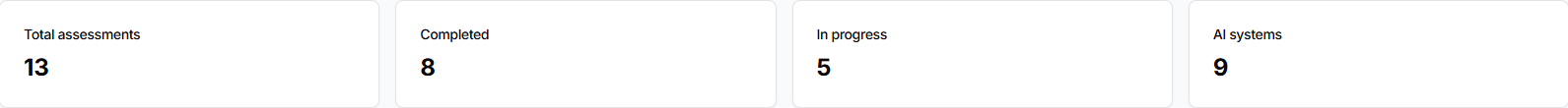 This dashboard helps organizations manage the evaluation of AI-related risks by surfacing in-progress and completed assessments in one place. It supports visibility, tracking, and follow-through on required governance actions.
