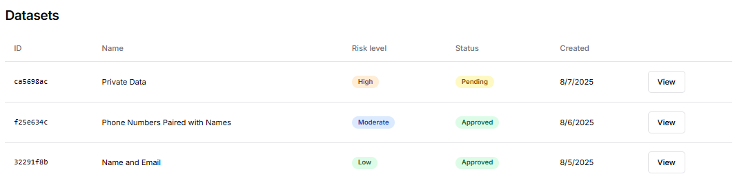 • View – Click View to open the full dataset record. This provides access to detailed metadata, risk assessments, linked AI systems, and documentation. See: Viewing a Dataset