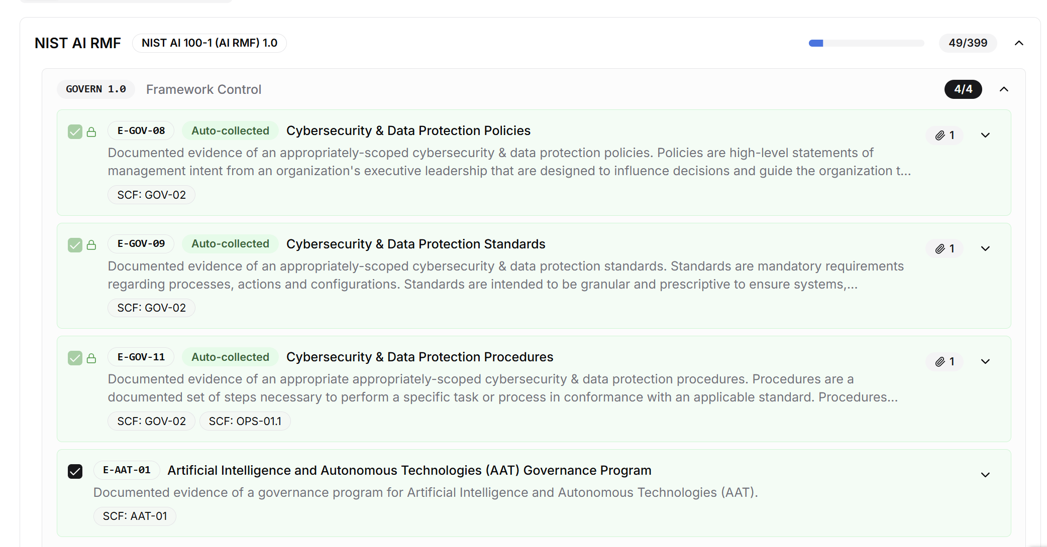Each compliance framework (for example, NIST AI RMF) is broken down into individual controls with clear evidence requirements.