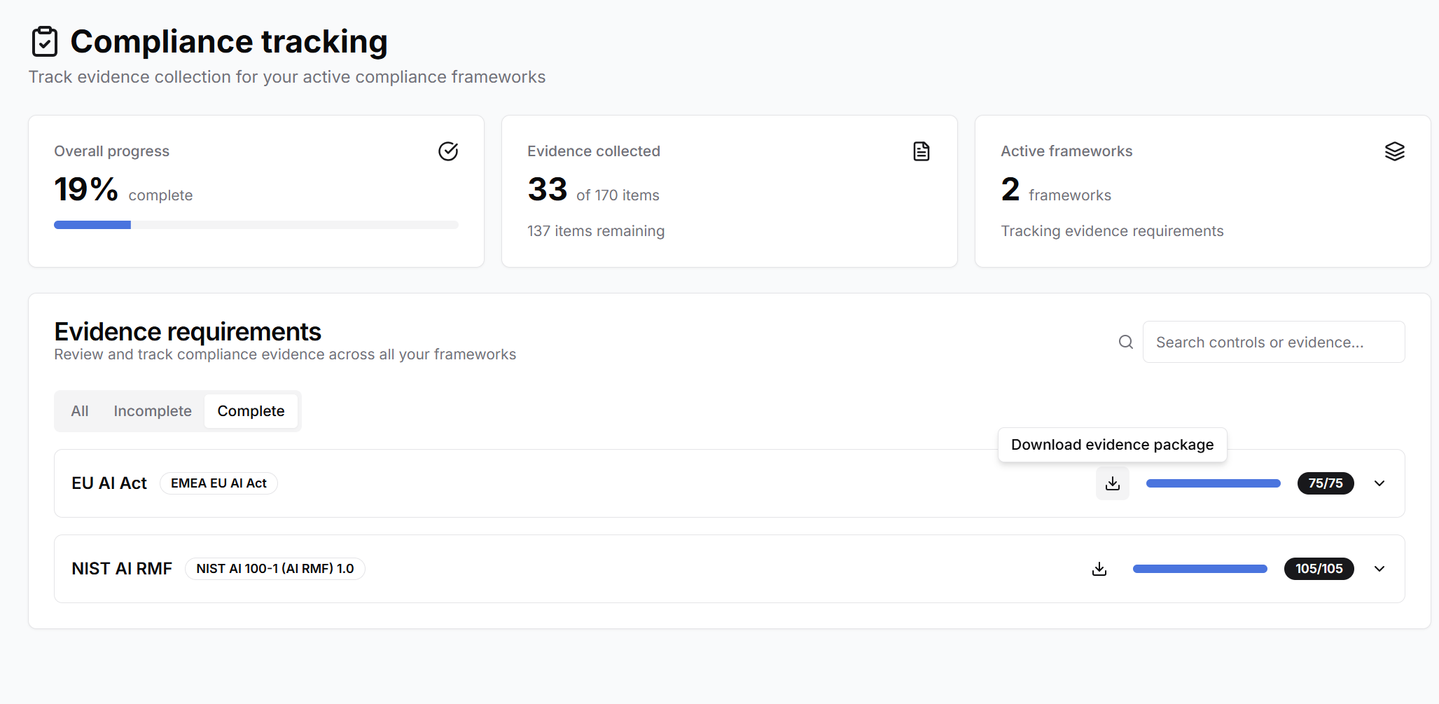 - Evidence packages reflect the current state of your compliance tracking at the time of download