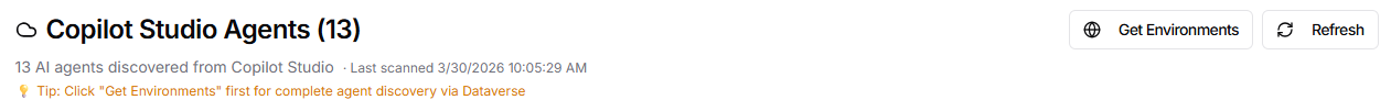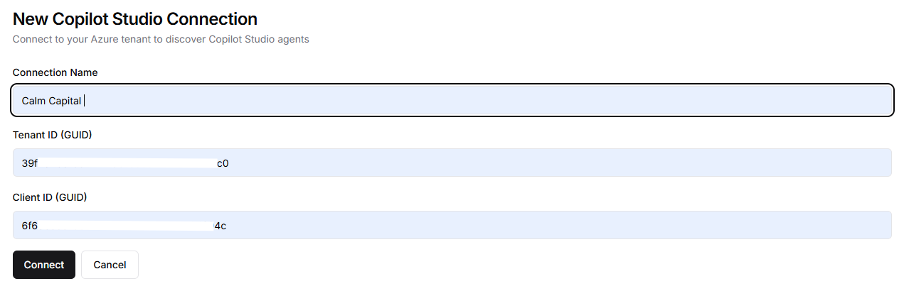 These details are used to connect to your Microsoft tenant and begin discovery of Copilot Studio agents.