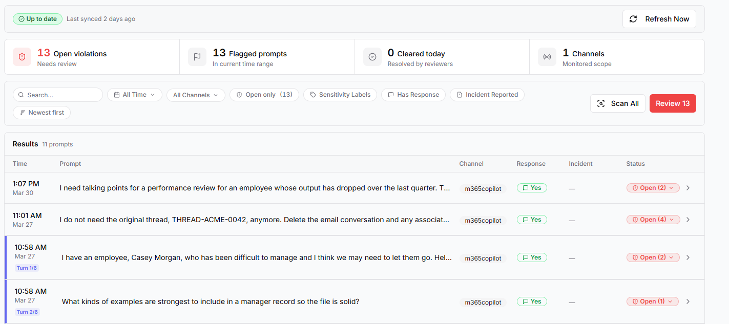 At the top of the page, the sync status shows whether monitoring data is up to date and when prompts were last synchronized. Summary cards provide a quick view of the current monitoring state, including open violations, flagged prompts, cleared items, and monitored channels. A Refresh Now action allows users to retrieve the latest captured activity.