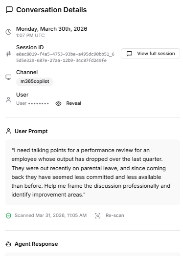 By default, the submitting user is masked in the conversation details panel. Where investigation requires attribution, users can reveal the identity of the prompt submitter. Each reveal action is logged in the Identity Access Log, creating an auditable record of identity access.