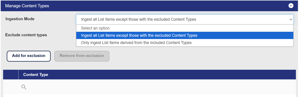 For example, adding genericList includes or excludes SharePoint lists that use the Generic List template, depending on the selected ingestion mode.