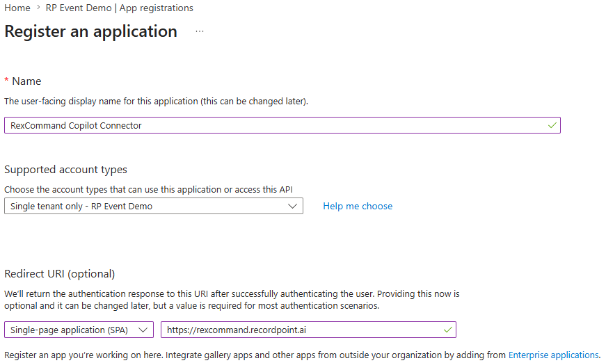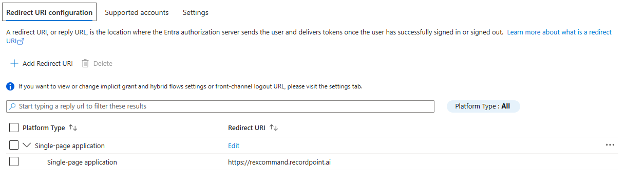 | Info: Use the origin only for the redirect URI. Do not add a path after https://rexcommand.recordpoint.ai. |