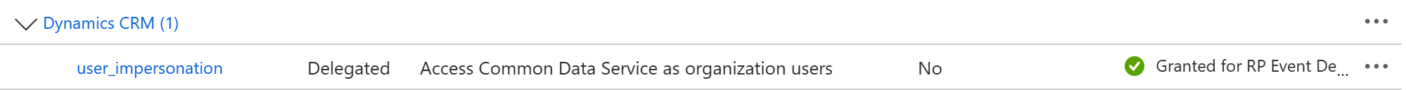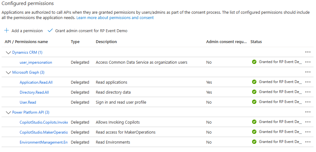 - The required Microsoft Graph, Dynamics CRM, and Power Platform API delegated permissions are granted.