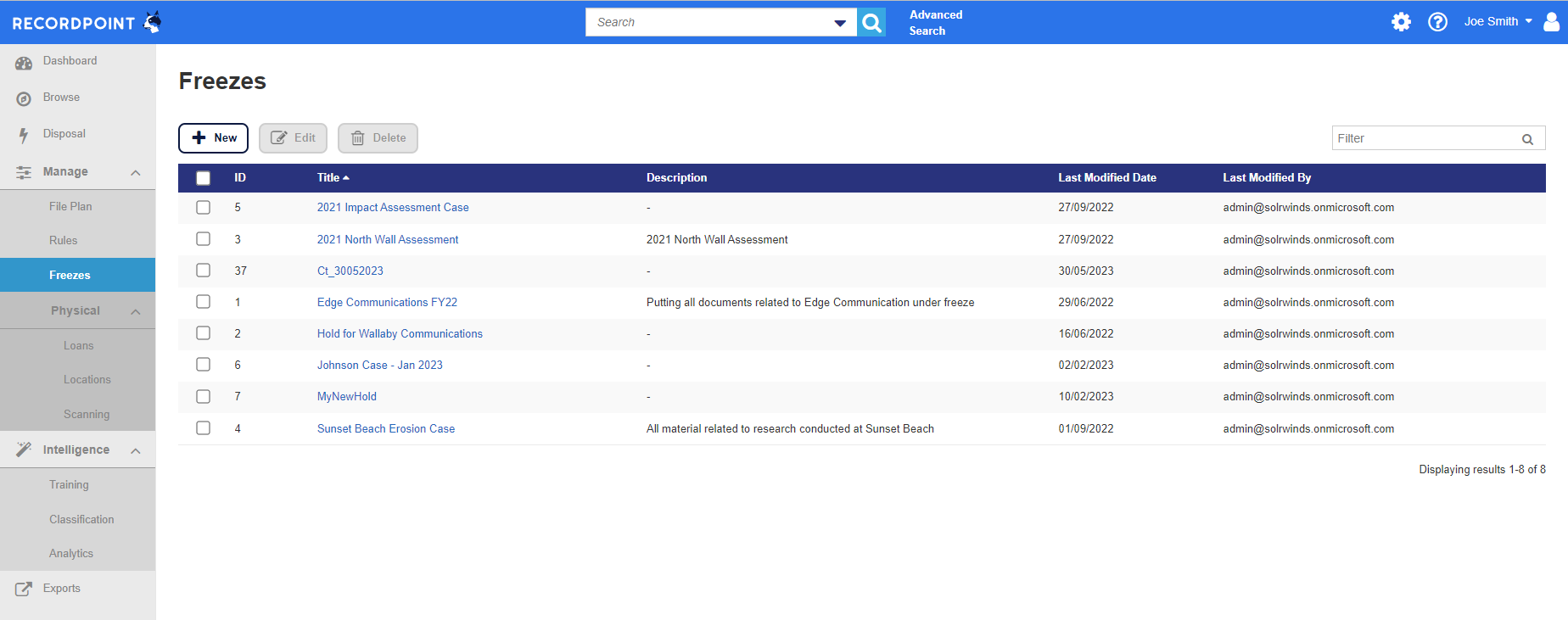 As a freeze/hold can only be deleted after removing all records placed under it, the processing time for a Delete Freeze/Hold action can vary depending on the number of records and other concurrent actions ongoing in your tenant. While it is being processed, if another record is added to the freeze/hold before it can be deleted, the Delete Freeze/Hold action will fail.