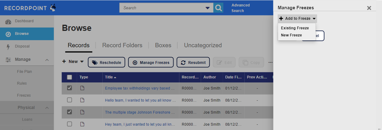 From the Browse page, select one or more records to add to a freeze/hold. Selecting the checkbox in the header selects all the items listed on the page.
