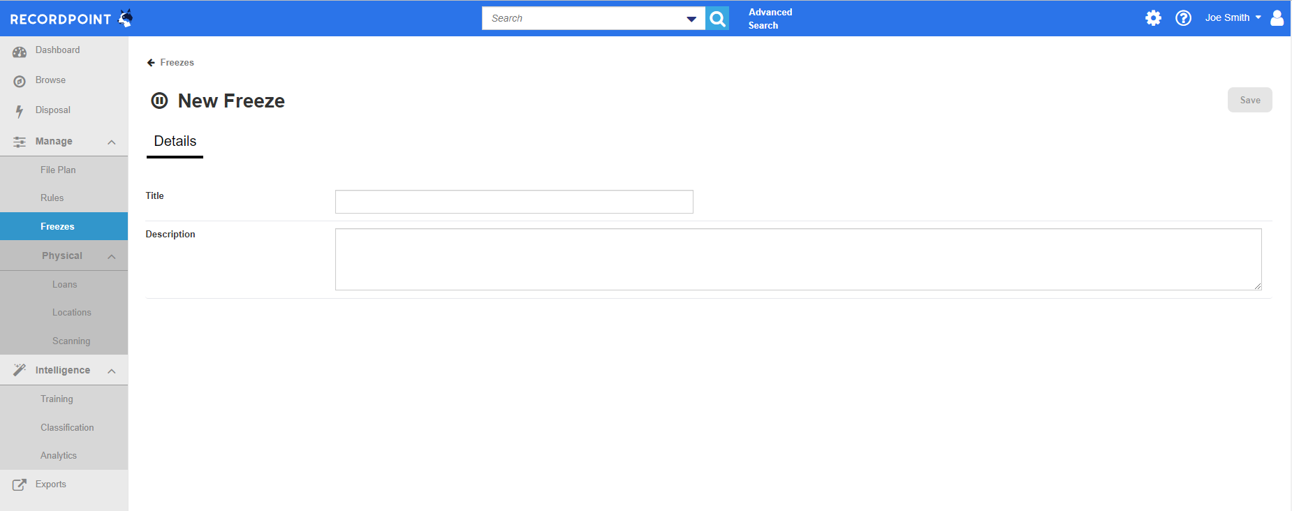 A freeze (also known as a Hold) suspends or extends the lifecycle of records that cannot be destroyed on schedule because of special circumstances, such as a court order or an investigation. Records can continue to be modified whilst being held under a freeze/hold.