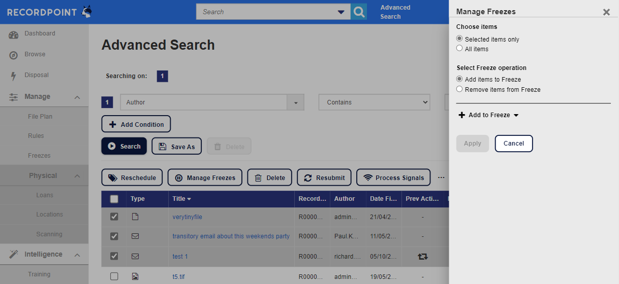 When adding large numbers of records to a freeze/hold, the processing time will depend on the number of records in that action and other concurrent actions ongoing in your tenant. While the action is being processed, records that are yet to be added to the freeze may be disposed of if they have met the disposal criteria and are not part of any other freeze.