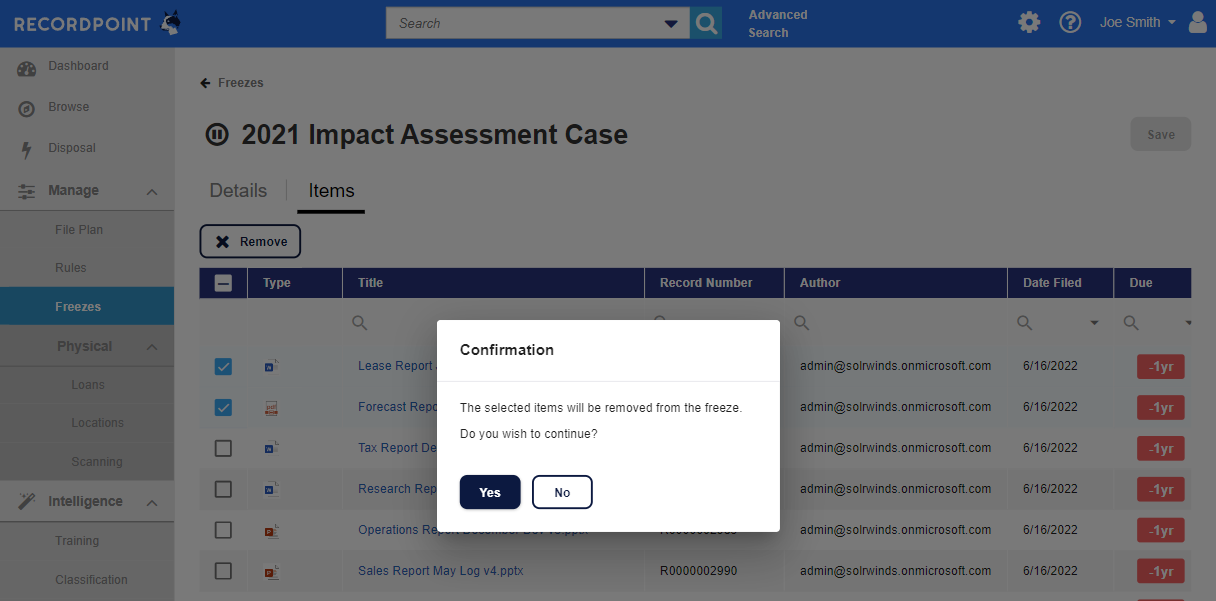When a record is removed from all freezes/holds, the suspension on its disposal schedule is lifted and it can be disposed of as per the file plan associated with its classification.