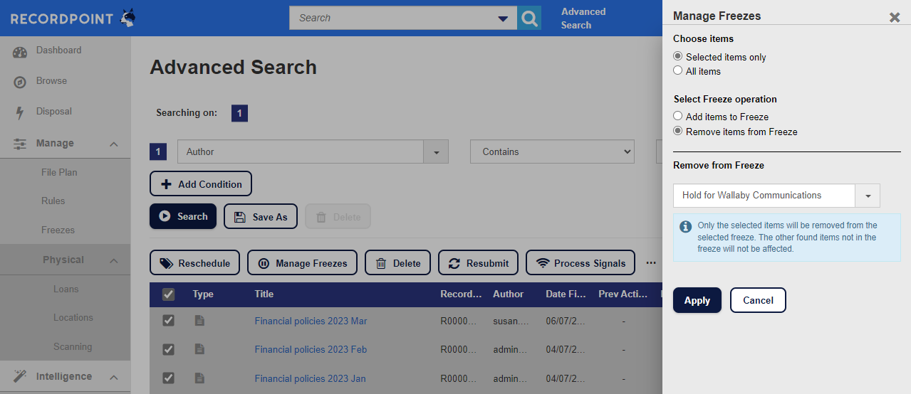 Select one or more records using the checkboxes and click Manage Freezes/Holds.