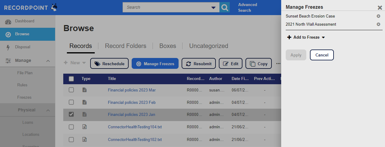 On the Browse page, if you select a single record and click Manage Freezes/Holds, the side panel will display all the freezes/holds currently applied to the record.