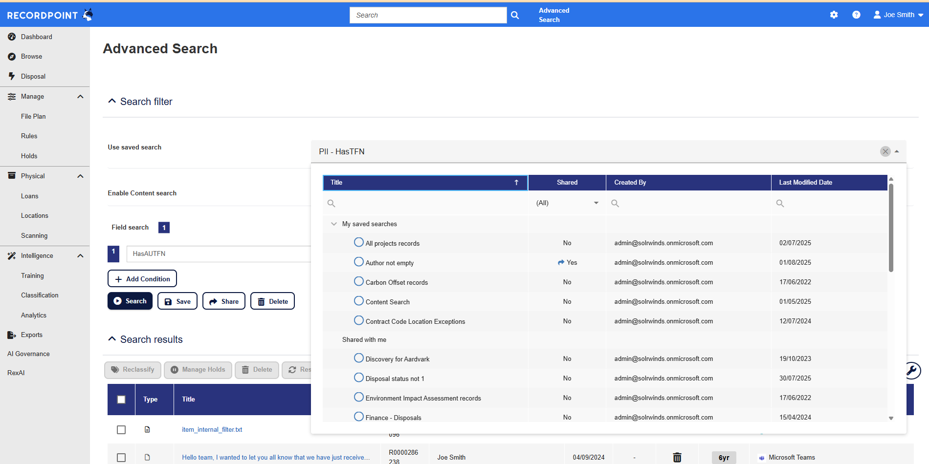 If you frequently run the same search, you can save it for future use. Saved Searches allow you to quickly apply predefined filters without rebuilding your query each time. To save an Advanced Search query you can either go to the Advanced Search page or the Disposal page.