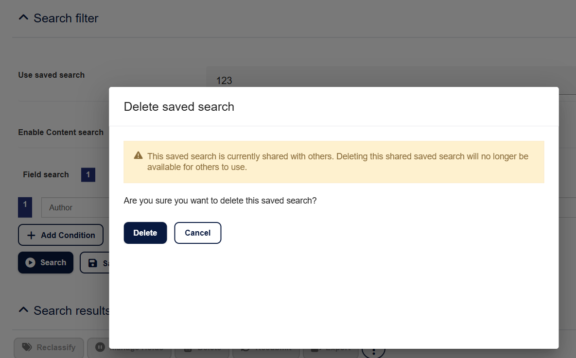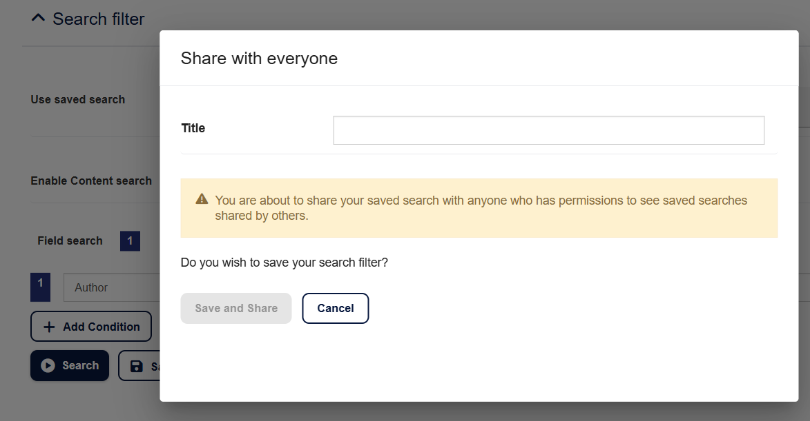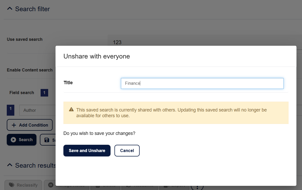 - Confirm the sharing action when prompted, this ensures you understand the search will be visible to anyone with View Saved Searches (Sharing Enabled) permission.