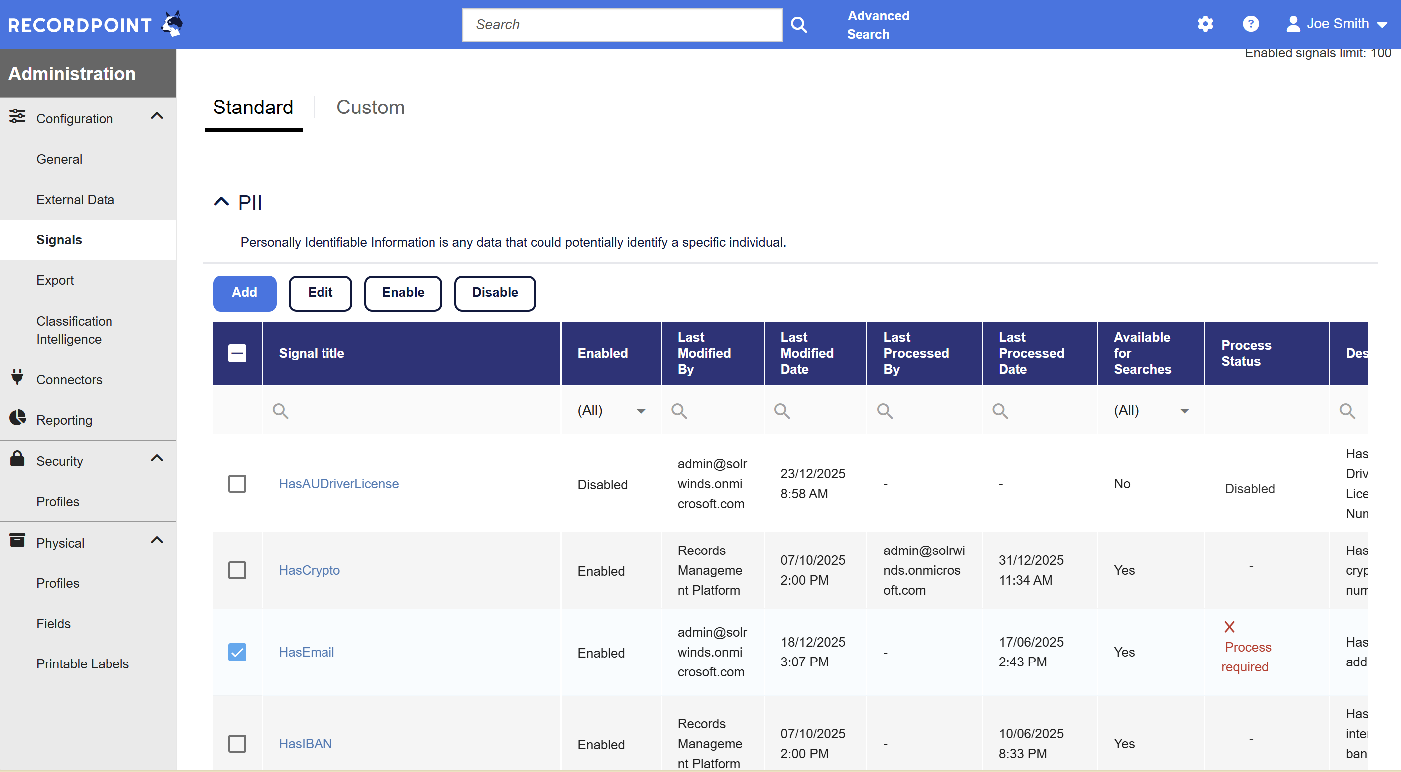 RecordPoint provides predefined recognizers, known as Standard Signals, for detecting PII, PCI, ROT and other categories. This page outlines examples of the entities RecordPoint can identify, explains the detection methods used, and describes the customization options available for Standard Signals.
