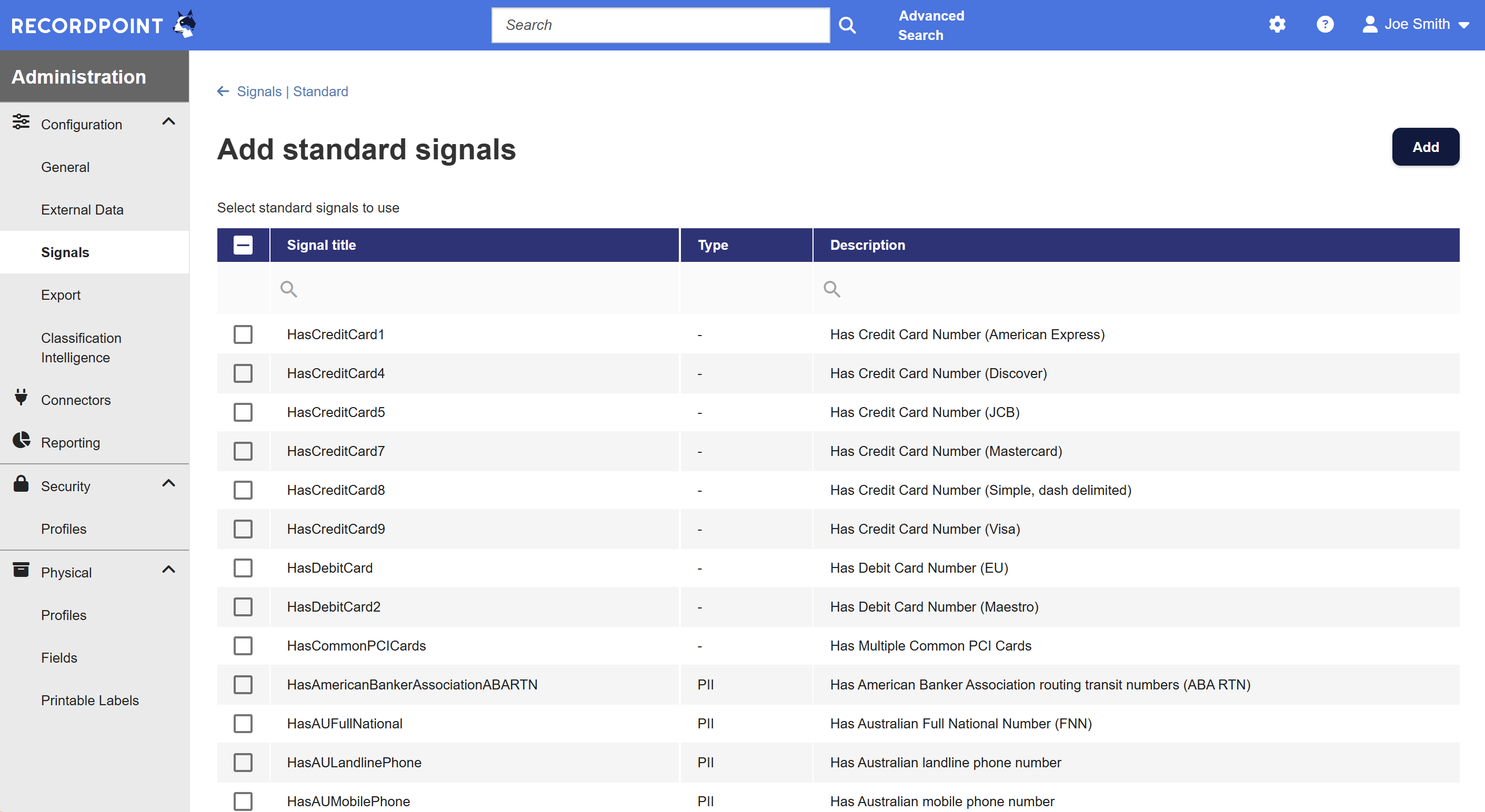 Additional 170+ out-of-the-box recognizers can be added to the list of signals to be processed on ingested content by clicking the Add button on the Standard Signals page.