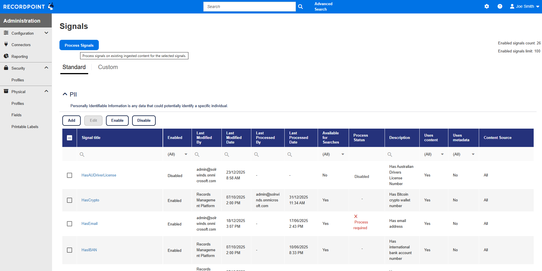 Enabling a signal applies it to newly ingested content. To process enabled signals on existing content, click on Process Signals