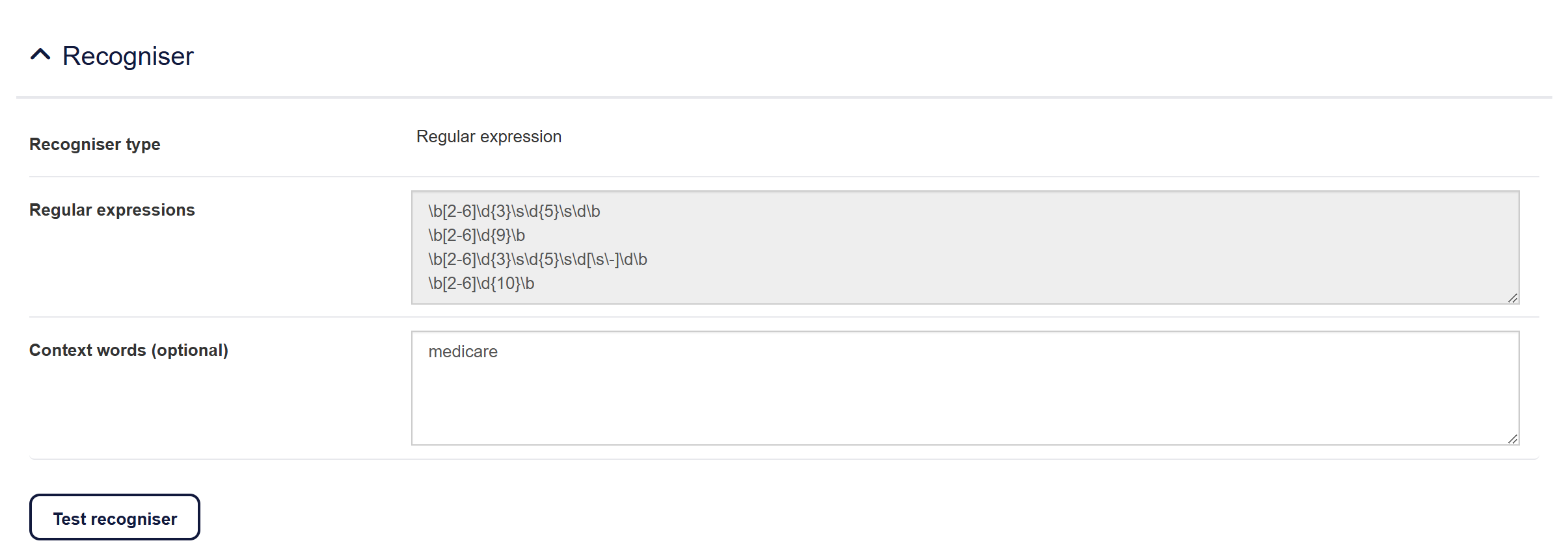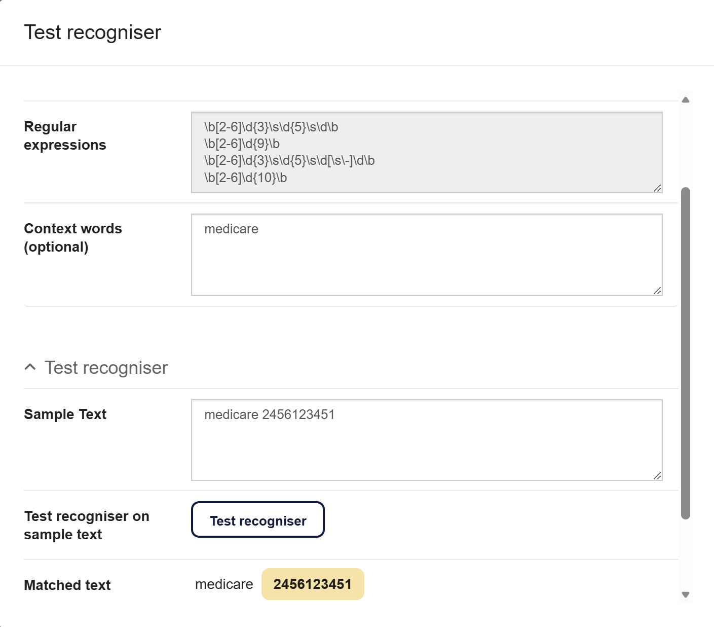 It is possible to test standard signals and their context words before enabling them by selecting Test recogniser, if any matches are found they will be highlighted: